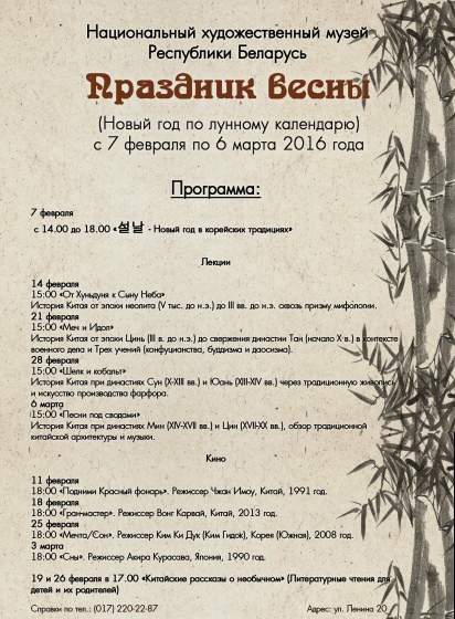 В Национальном художественном музее Республики Беларусь отметят Новый год по лунному календарю. В феврале 2016 года выставочные залы музея превратятся в площадки, где пройдут лекции, кинопоказы, литературные чтения и авторские интерактивные программы. Каждое из этих событий расскажет о культуре Востока и объединится под общим названием – «Праздник весны».