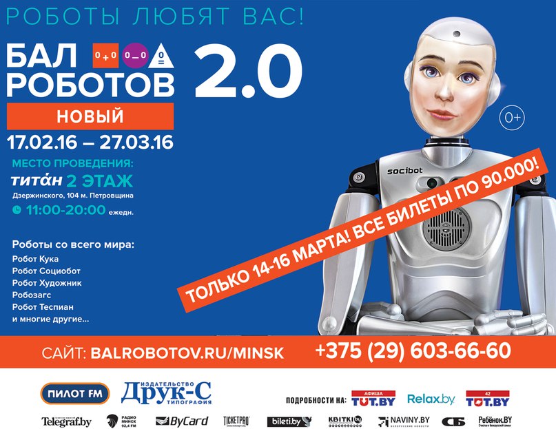 И только 15-16 марта познакомиться с роботами-андроидами, роботами-танцорами, роботом-художником, роботом-актером, роботом-консультантом, робот-тюленем, роботом-баскетболистом и другими можно всего за 90 000 бел. руб. Цена снижена практически в два раза – стоит воспользоваться выгодным предложением, которое принесет массу ярких положительных эмоций!
