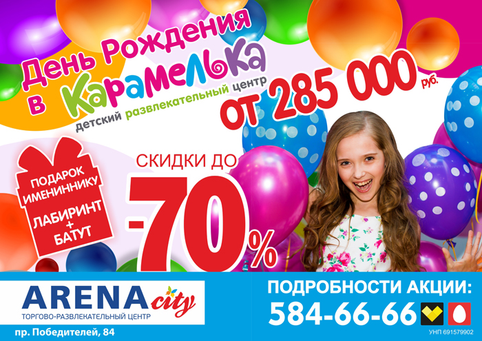 Детский развлекательный центр «Карамелька» объявляет супер-цены на организацию детских праздников. Весной и летом вас ждет сладкое предложение на День Рождения со скидкой 70%. С 1 апреля по 31 августа стоимость праздничных пакетов - от 285 000 руб. И это еще не всё. Именинник получает в подарок услугу «Лабиринт+Батут» бесплатно при заказе мероприятия от 6-ти детей.