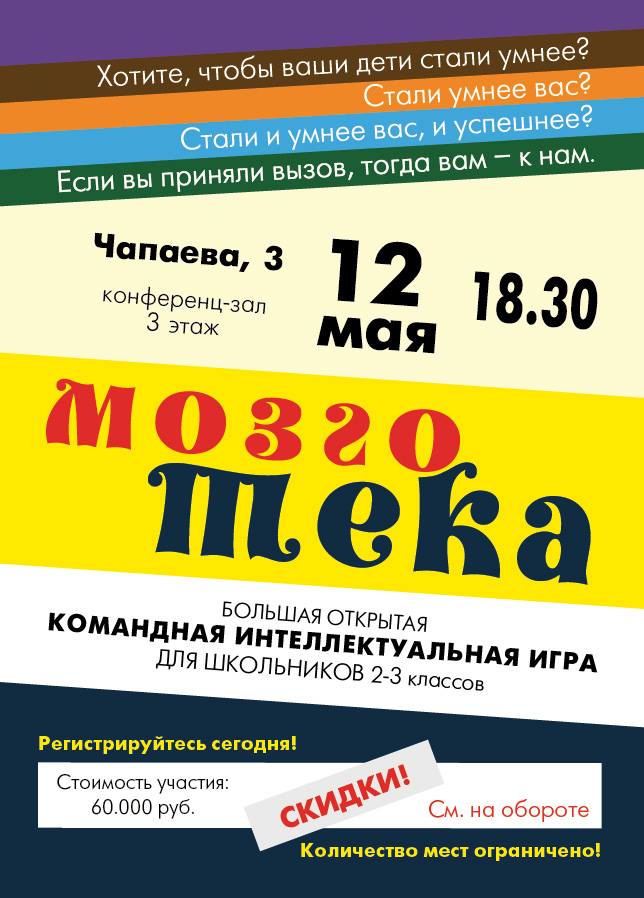 Мозготека – большая детская командная интеллектуальная игра. Участников ждут вопросы на логику, смекалку, креативность, память, а также полезная информация из разных областей знаний.