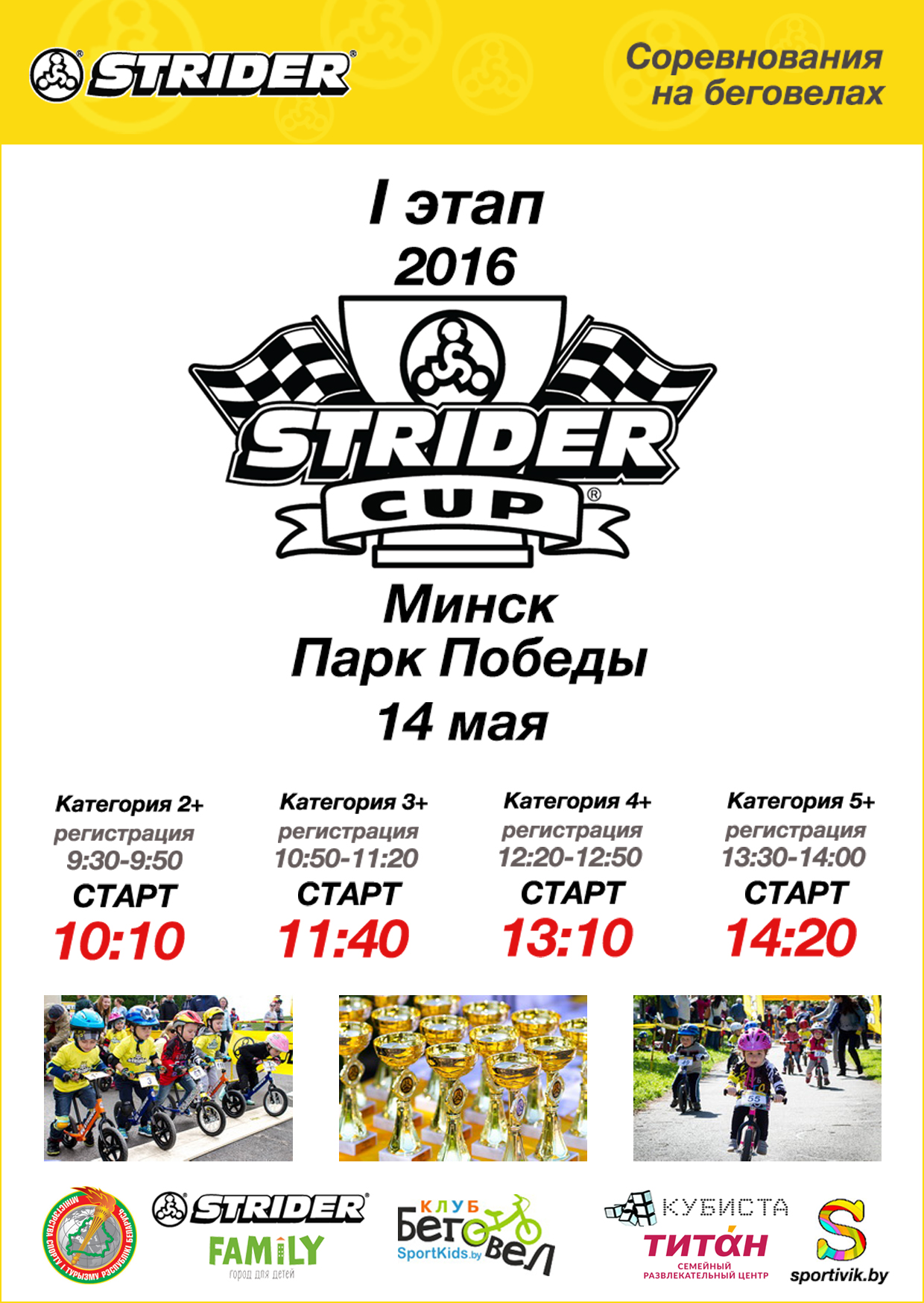 Клуб беговел SportKids.by приглашает детей 1-5 лет на Международные соревнования на беговелах 1-й этап Strider Cup 2016, Minsk. Во время соревнований будет работать бесплатная детская зона со спорткомплексами, батутами, конструкторами. Не пропустите настоящий беговелопраздник!
