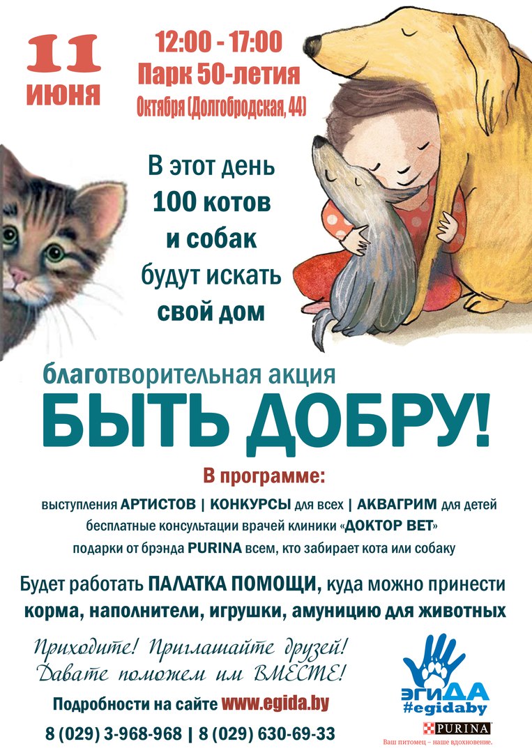 На акции будет работать «Палатка помощи», куда в течении всего дня Вы сможете принести корм, амуницию и все, что необходимо животным. В программе выступления артистов, аквагрим и конкурсы для детей, бесплатные консультация ветеринарных врачей и многое другое.