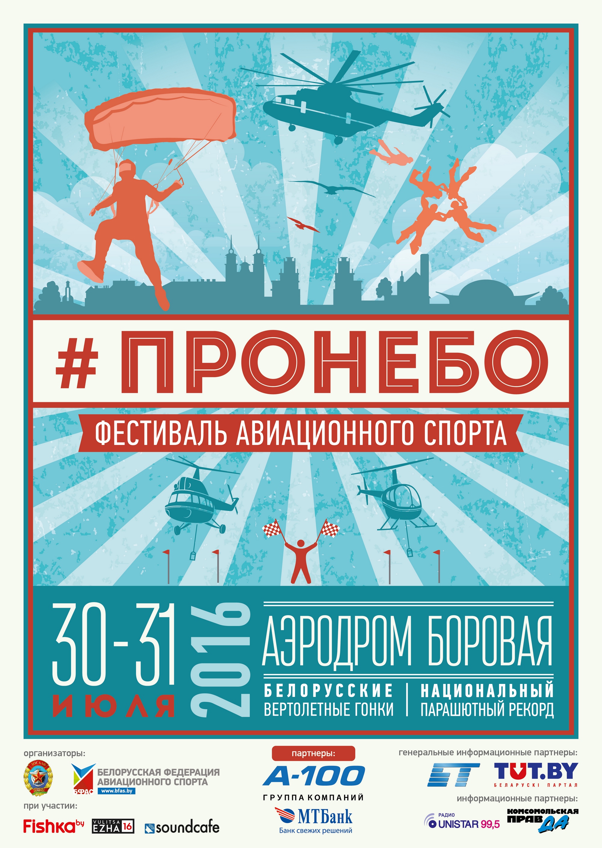 30-31 июля с 10.00 на аэродроме «Боровая» во второй раз пройдет фестиваль авиационного спорта под открытым небом #пронебо-2016. В течение двух дней фестиваля будет работать фудкорт Vulitsa Ezha и релакс-зоны, проводиться мастер-классы в тематике праздника от Active Team, стрельба из лука, дети смогут попрыгать на надувных батутах, посмотреть на мыльные пузыри и поиграть с аниматорами.