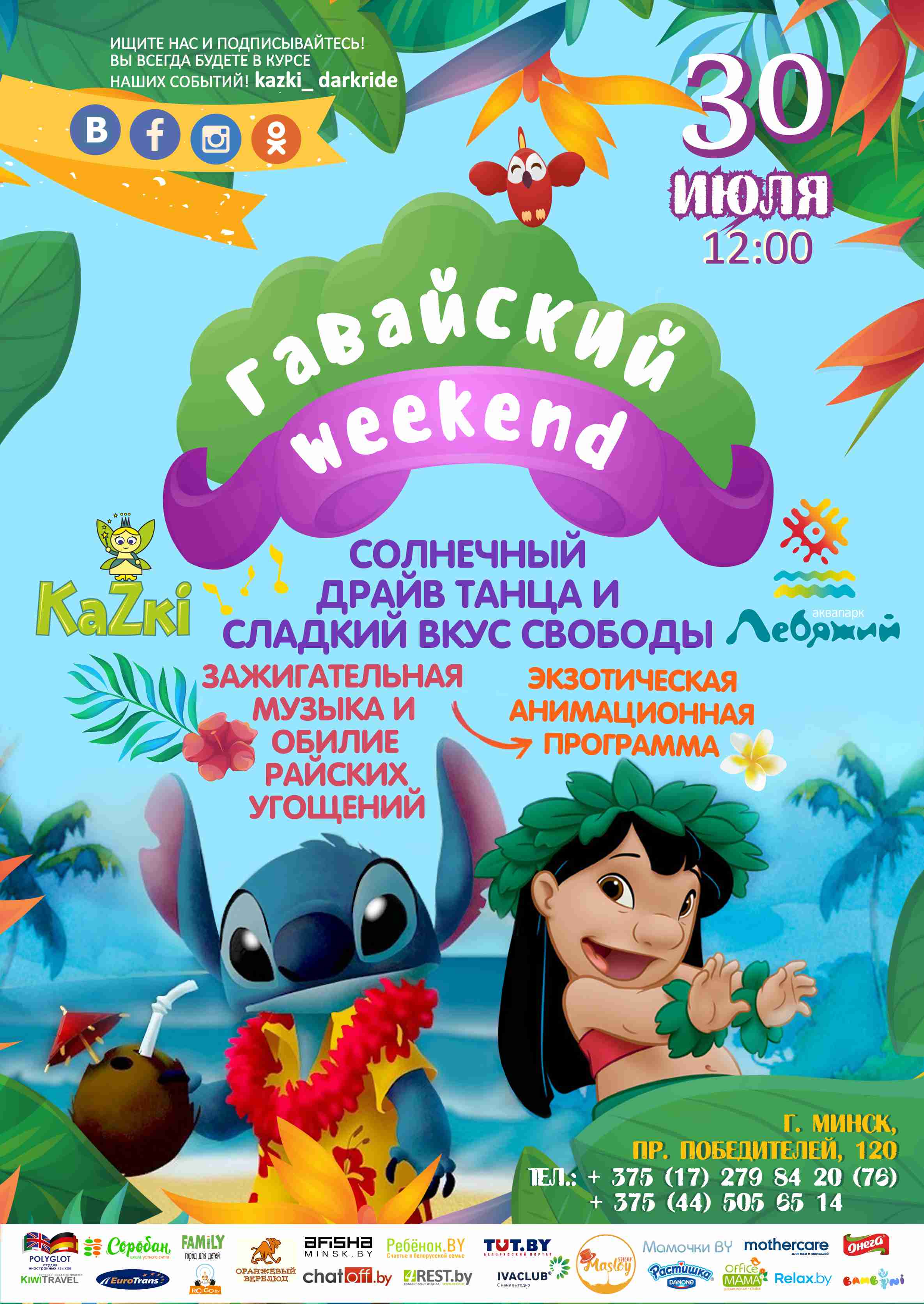 Семейно-развлекательный центр «KaZki» аквапарка «Лебяжий» приглашает всех ребят 30 июля в 12:00 на солнечный «Гавайский WEEKEND». В программе солнечный драйв танца и сладкий вкус свободы, мастер-класс по Лимбо, экзотическая анимационная программа и многое другое.