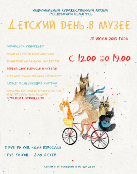 Дети и их родители в этот день попадут не просто в музей, а в импровизированный Музейный город искусств. В этом городе невозможно заблудиться или потеряться, здесь всегда светит солнце и сияют улыбки. Бродить по городу можно весь день, но обязательно нужно посетить главные городские достопримечательности: городской кинотеатр, архитектурный воображариум, академию маленьких экспертов, перекресток вопросов и ответов, переулок таинственных скульптур.