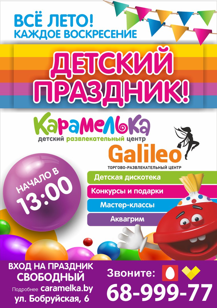 Детский развлекательный центр «Карамелька» в ТРЦ Galileo приглашает всех малышей и их родителей на веселый праздник. В программе шоу аниматора, дискотека, аквагрим и зона творчества.