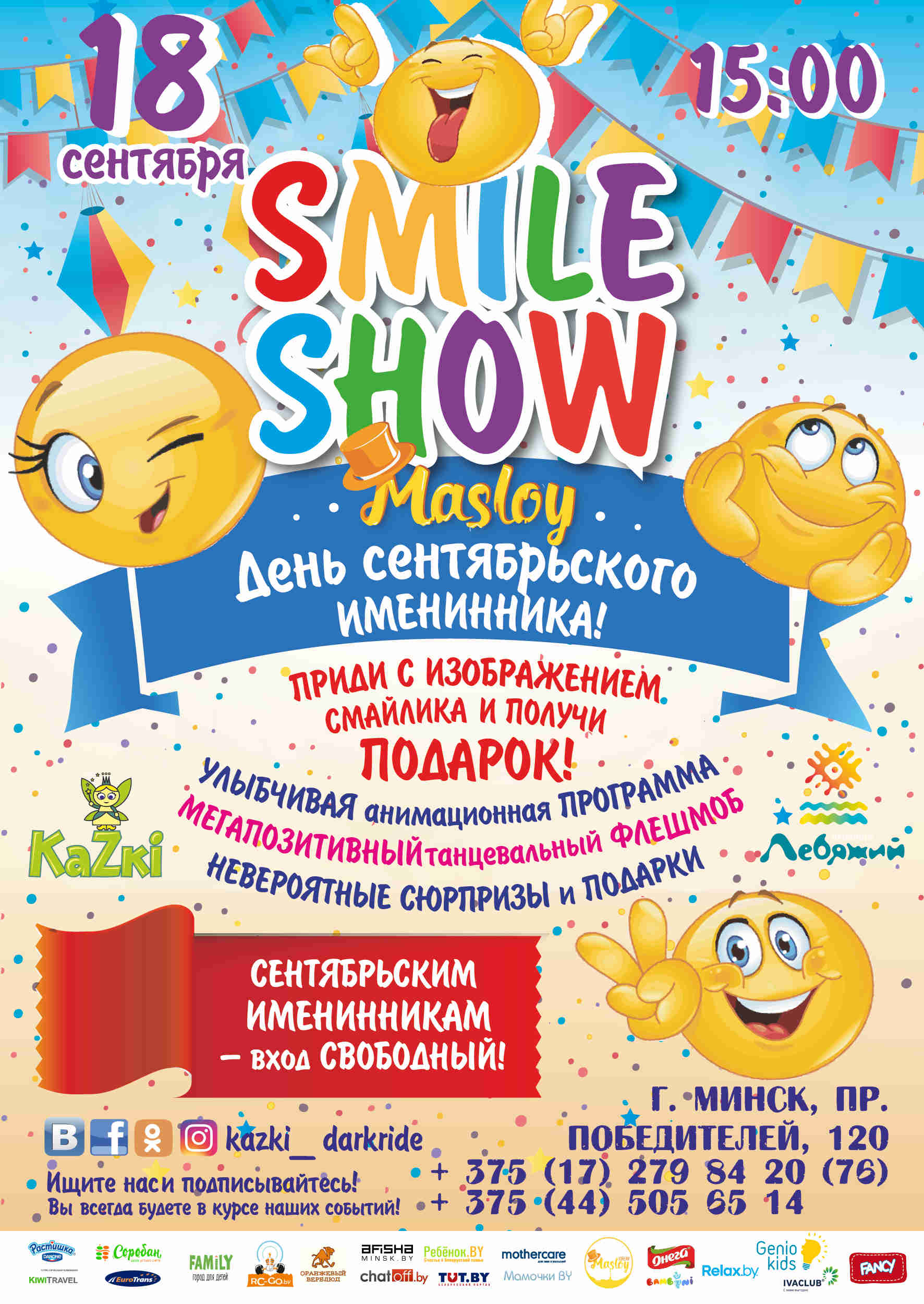 одежде, обуви или с вещами с изображением смайлика, получат подарок. В программе вас ждут улыбчивая анимационная программа, мегапозитивный танцевальный флешмоб, мастер-класс по лепке смайлика из