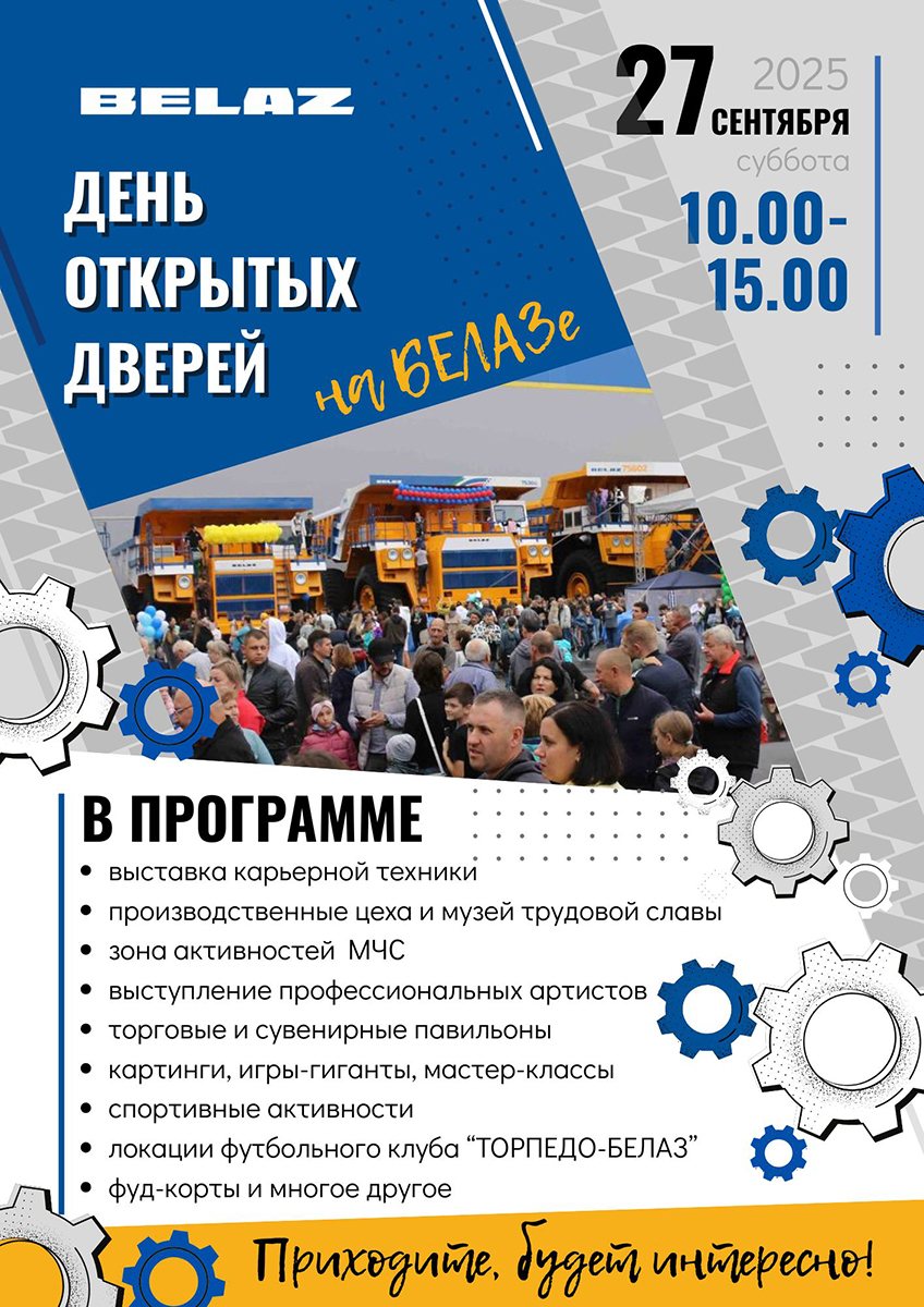 Поучаствовать в праздничных мероприятиях завода БелАЗ можно 27 сентября 2025 с 10.00 до 15.00 по адресу: Минская область, г. Жодино, ул. 40 лет Октября, 4. Вход свободный