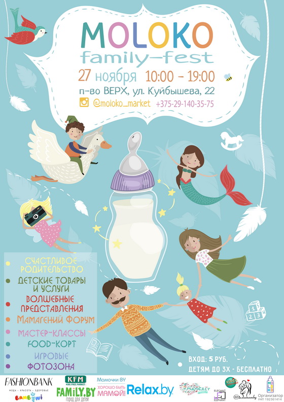 На этой неделе маленькие минчане и их родители смогут посетить семейный фестиваль «МOLOKO family-fest» или потанцевать и попеть во весь голос на детском концерте группы «Sounduk», посмотреть спектакль «Птица-поезд-патефон» или принять участие в мастер-классе «Давайте рисовать как великие художники», получить массу удовольствия на фестивале студенческих театров «Тэатральны куфар» или познакомиться с настоящим писателем и иллюстратором детских книг на презентации книги «Снежны чалавек у Мінску» и это еще далеко не все. Еще больше мероприятий в нашей рубрике