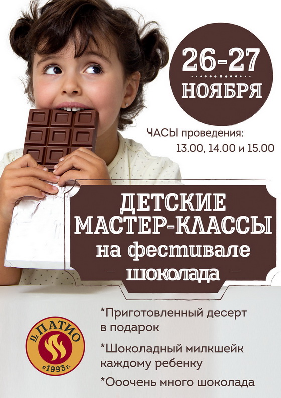 На фестивале можно будет рисовать, лепить и наслаждаться сладостями весь день! В программе: детский мастер-класс по приготовлению десертов, самая большая шоколадка, фантастическая фотозона, призы и подарки, а также ооочень много шоколада.