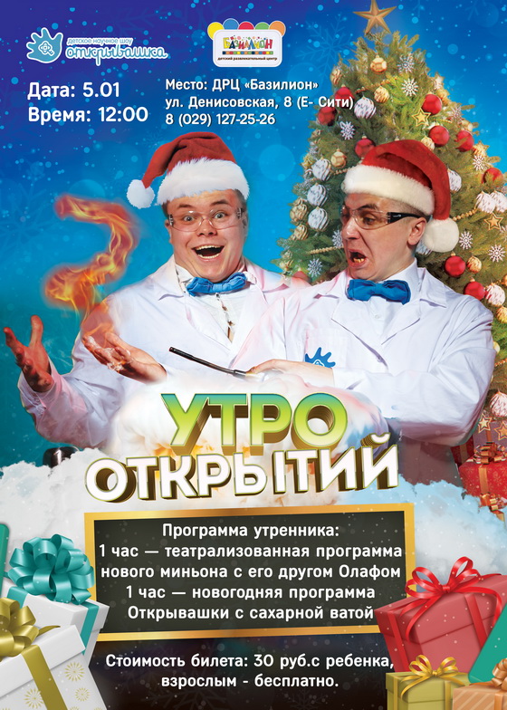 Гостей ждут театрализованная программа нового миньона с его другом Олафом, а также новогодняя программа Открывашки с сахарной ватой.