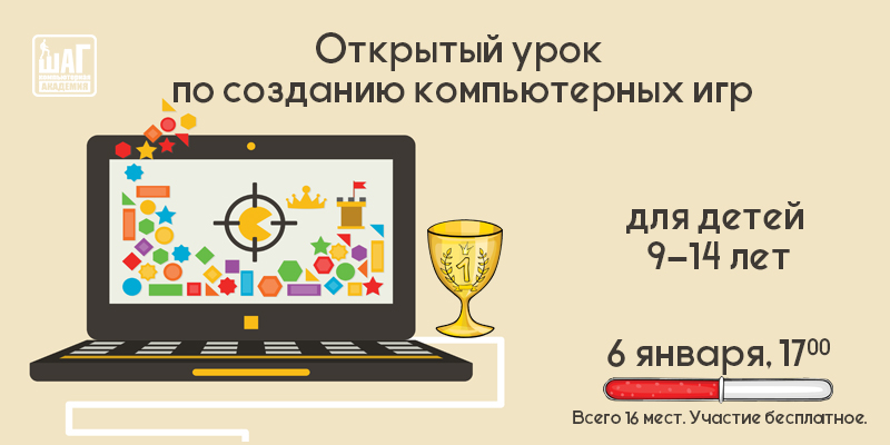 6 января компьютерная академия «Шаг» проведет бесплатный открытый урок по созданию игры для детей 9-14 лет. Во время урока ваш ребенок будет творчески мыслить, придумывать собственные истории и программировать их, создаст свою первую игру и анимированные рисунки. Одновременно с созданием игры изучаются основы алгоритмики и программирования.