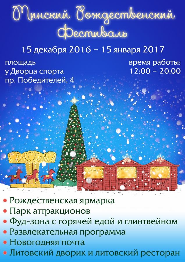 Минчанам и гостям столицы будет предложена рождественская ярмарка с новогодней елкой, парком аттракционов и обширной развлекательной программой для детей и взрослых.