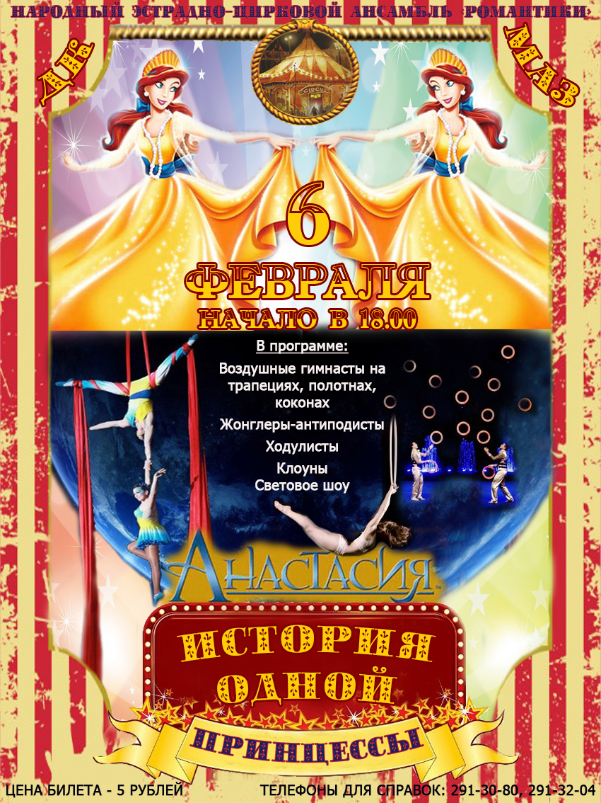 Яркий, творческий проект про маленькую девочку Анастасию, которую подобрали бродячие артисты. Они воспитали и обучили ее разным цирковым жанрам, поэтому на сцене будут представлены номера самых разнообразных жанров в исполнении воздушных гимнастов на трапециях, полотнах и коконах, жонглёров – антиподистов, ходулистов, клоунов.