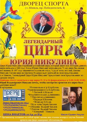 Легендарный Цирк Юрия Никулина представит свои представления во Дворце спорта: Русская палка,Трансформация, Пара петли, номера с медведями, попугаями, обязьянами и другие.
