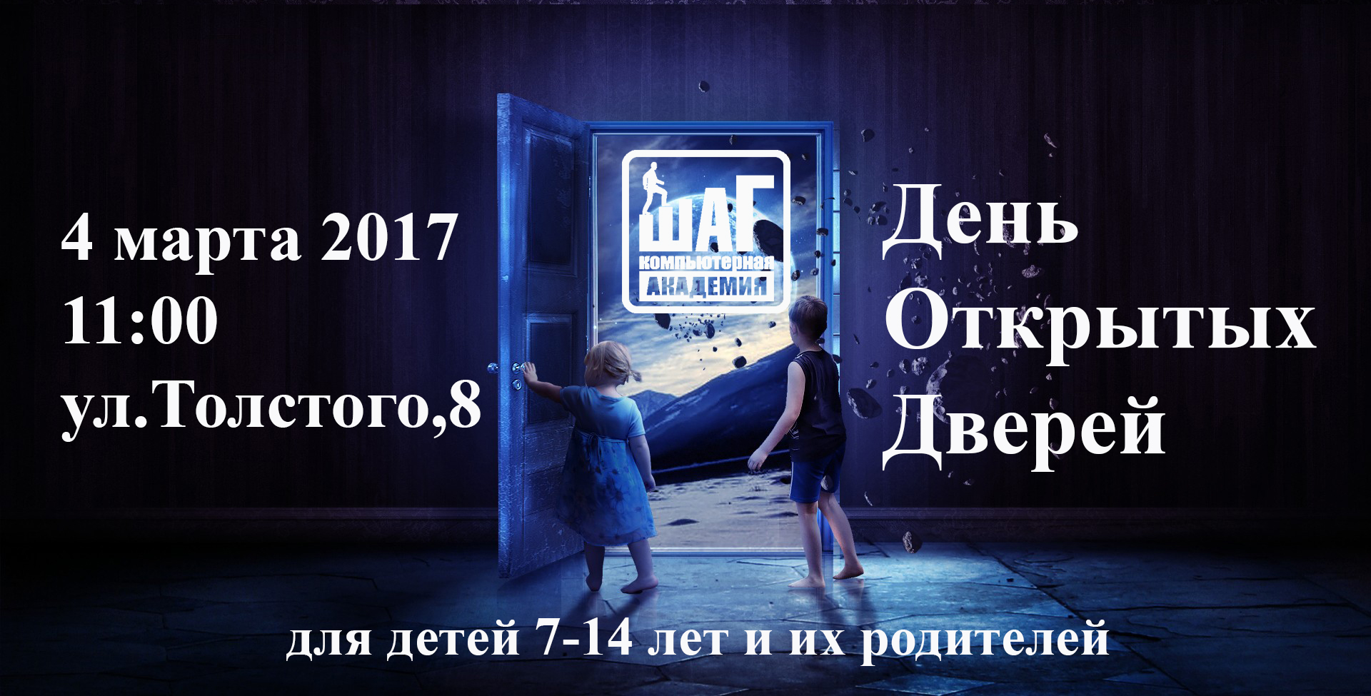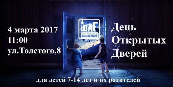 Хотите направить увлечения Вашего ребенка в правильное русло? 4 марта в 11:00 компьютерная Академия ШАГ приглашает родителей и детей от 7 до 14 лет на День открытых дверей! Компьютерная Академия ШАГ — это место, где каждый юный школьник сможет проявить свои способности, обучиться современным информационным технологиям, сформировать прочный фундамент логических, технических, организаторских навыков, повысить успеваемость в школе среди сверстников и построить успешное будущее.