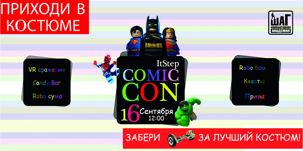 Comic Con ItStep — это отличная тусовка для всех, кто любит комиксы, игры, аниме, фильмы и сериалы. В программе: бои роботов и Робо сумо, VR сражение, квесты и многое другое.