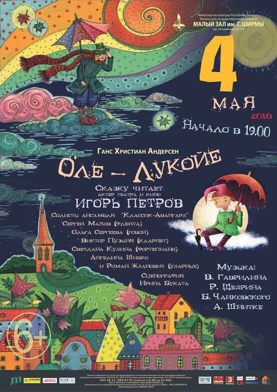 Филармония приглашает детей и взрослых на концерт по сказке Ганса Христиана Андерсена «Оле Лукойе». Текст сказки читает актер театра и кино Игорь Петров. Выступают также солисты ансамбля «Классик-Авангард».