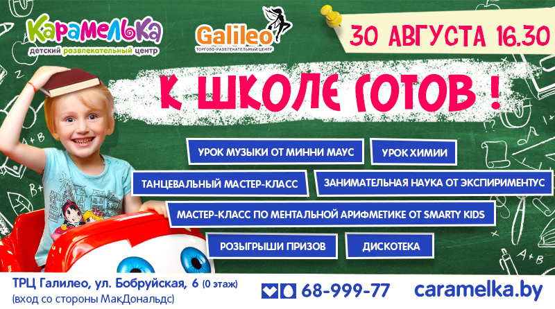 Лето подошло к концу, а доставать учебники и тетрадки пока не хочется. Карамельку Galileo приглашает 30 августа в 16.30 на праздник в честь начала учебного года. Вас ждёт химическое шоу, мастер-классы по хип-хопу и ментальной арифметике, фокусы, гигантская шахматная доска и стул для великанов, дискотека. А ещё розыгрыш подарков от Карамельки и её партнёров.