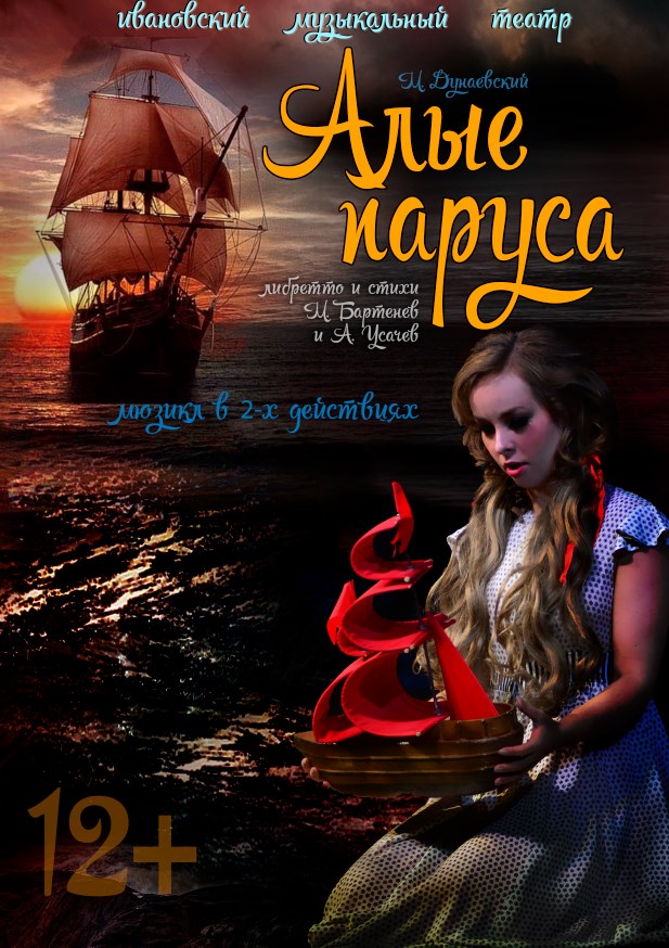 Гастрлли Ивановского музыкального театра. Романтическая повесть – феерия Грина обретает под их пером новое, во многом неожиданное звучание – новые герои, обстоятельства, сюжетные линии. Романтика этого мюзикла не поверхностно – возвышенна, она исходит из обстоятельств реальной жизни с её страстями и не очень привлекательными историями. Захватывающий сюжет, яркая символика, красивейшая музыка – у спектакля есть всё, чтобы стать настоящим «Гвоздём сезона». Гимн любви, не всегда логичной и рассудительной, часто отчаянной и порывистой, готовой ждать вечность и превозмогать все испытания – вот чем наполнена музыка «Алых парусов».