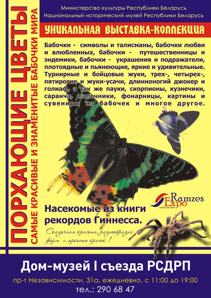 Экспонаты выставки «Порхающие цветы» поражают яркостью красок, разнообразием и изяществом форм. Здесь собраны дневные и ночные бабочки, обитатели тропических лесов и полярной тундры, гиганты и карлики, самые известные и недавно открытые виды, ядовитые бабочки и бабочки-путешественницы, самые редкие и самые дорогие, бабочки-символы и бабочки-талисманы.