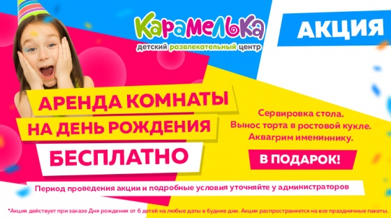 Как устроить ребёнку весёлый праздник, подарить много подарков и не травмировать семейный бюджет? Закажите День рождения в Карамельке на любой будний день и получите банкетную комнату и поздравление от ростовой куклы в подарок.