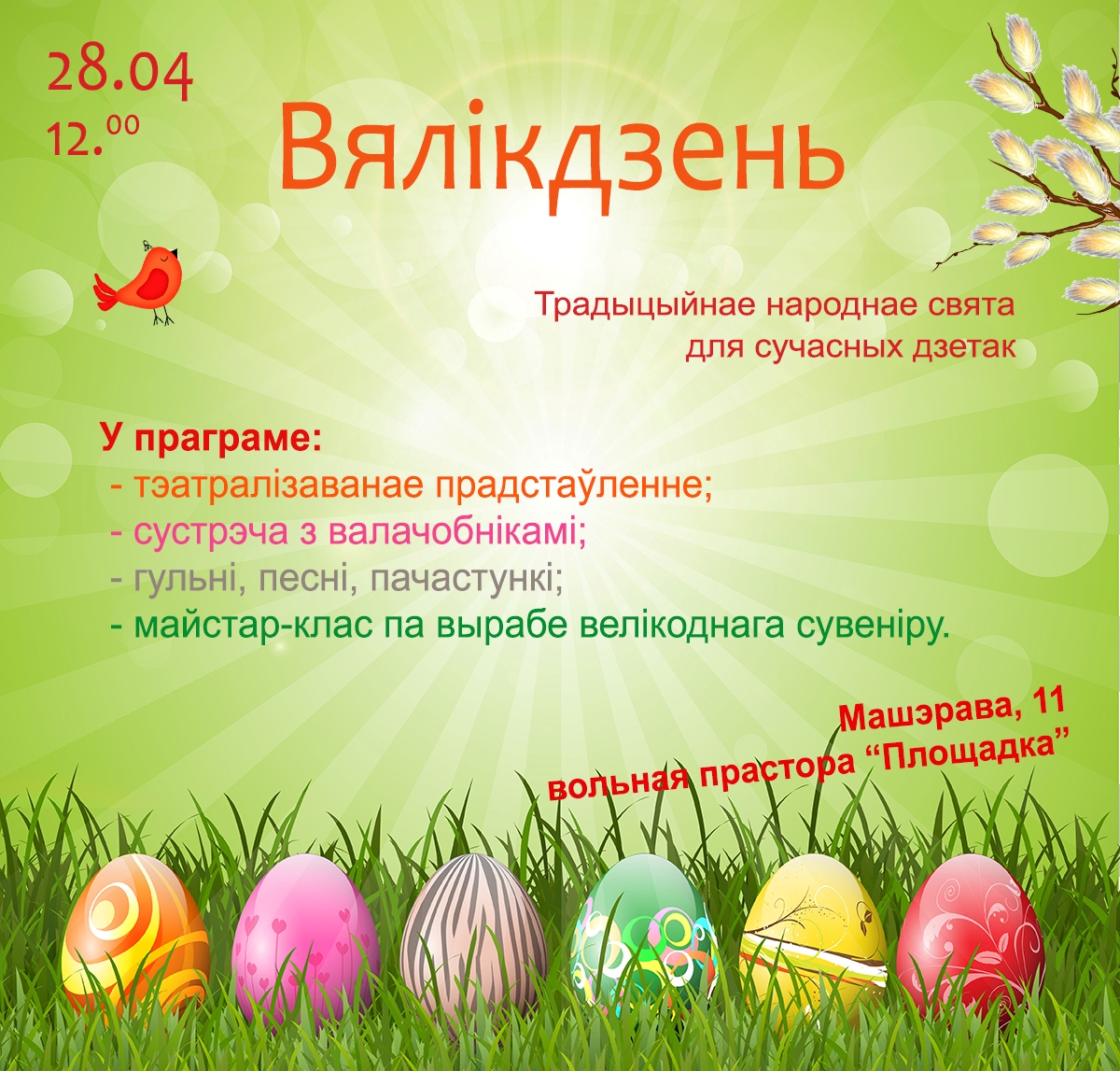Разам з героямі прадстаўлення ўдзельнікі пазнаёмяцца с велікоднымі звычаямі, у тым ліку унікальнай з'явай Валачобніцтва. Дзеці на нашых святах - не проста гледачы, а актыўныя ўдзельнікі. Будзем разам гуляць, спяваць, весяліцца.