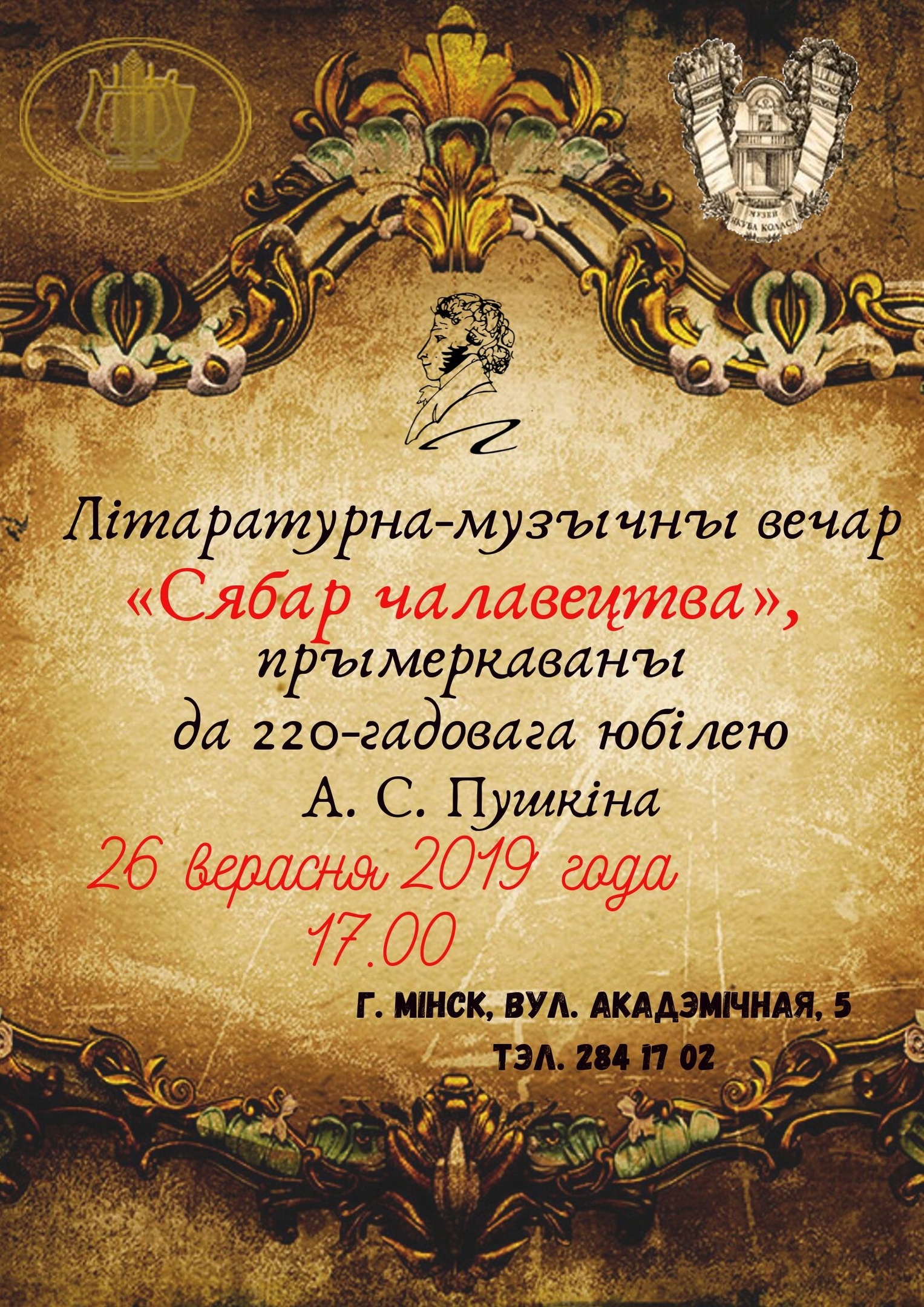 У рамках святочнага вечара будзе дзейнічаць выстаўка, арганізаваная сумесна з Мінскай абласной бібліятэкай імя А.С. Пушкіна. На ёй будуць прадстаўлены пераклады А.С. Пушкіна на беларускую мову, а таксама поўны збор твораў рускага паэта выдання пачатку ХХ ст., які, з успамінаў старэйшага сына Коласа Данілы Канстанцінавіча Міцкевіча, знаходзіўся ў даваеннай бібліятэцы беларускага класіка.