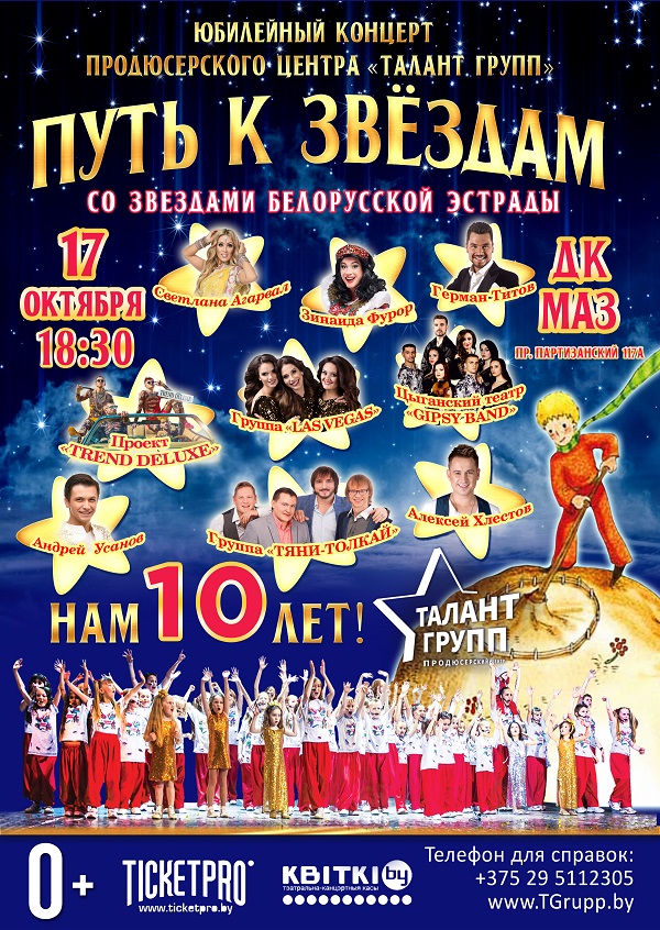 Зрителям будет представлена оригинальная программа – подходящая для всей семьи — мюзикл в 2-х действиях с антрактом. Главные герои познакомят зрителя с удивительной историей жизни «Талант Групп», где каждый найдет частичку себя, а Маленький Принц поможет заглянуть вглубь себя и найти ответы на волнующие вопросы. Проводниками этой увлекательной истории являются всеми любимые артисты белорусской эстрады, которые выступят с воспитанниками и выпускниками «Талант Групп» с попурри любимых зрителю песен.