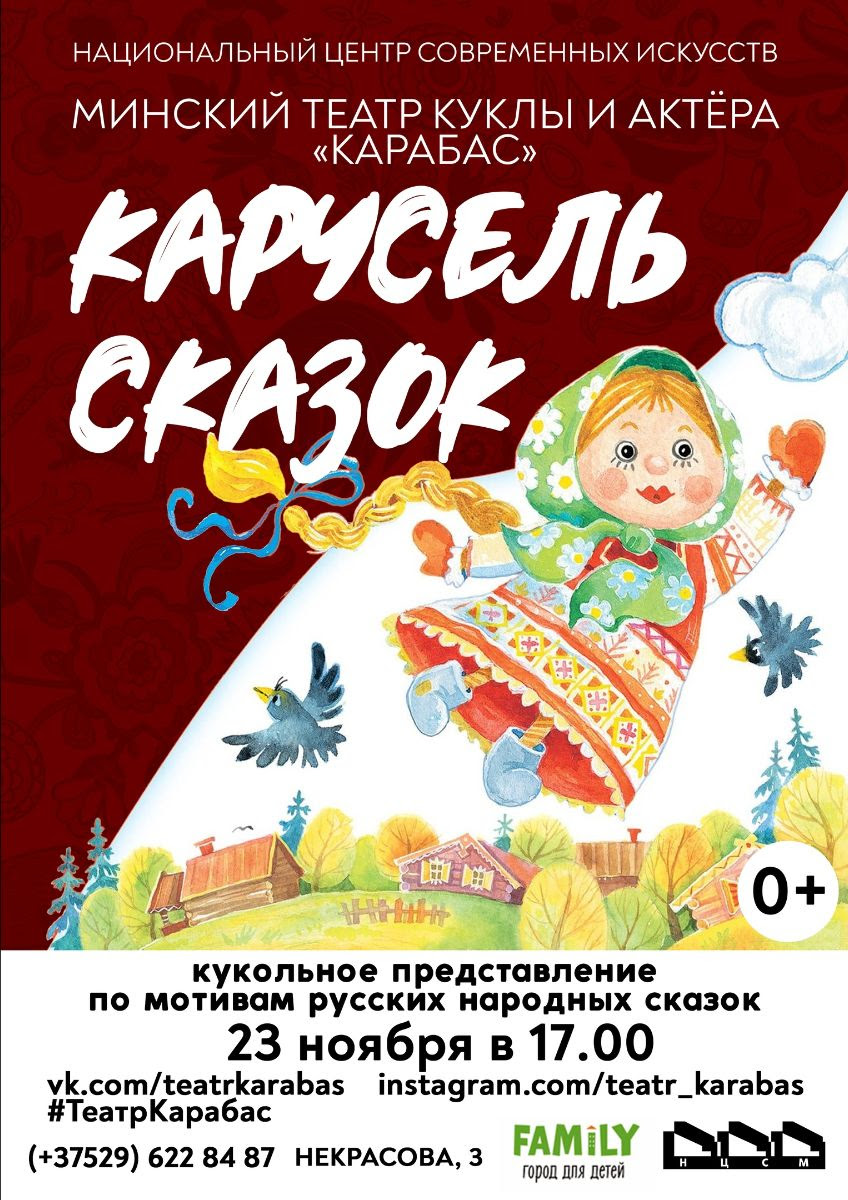 «Карусель сказок» - это весёлое скоморошье представление из шести самых популярных сказок, которые знают все. Хитрая лиса, глупый Волк, тугодум Медведь, обаятельный заяц, современный Колобок и смелый Петушок. Все они, в конце концов, окажутся вместе и победит дружба. Современное прочтение, юмор, выразительные куклы-марионетки, живой звук и весёлые артисты – всё это обязательно понравится всем, кому исполнилось 3 года, но ещё нет 10 лет.