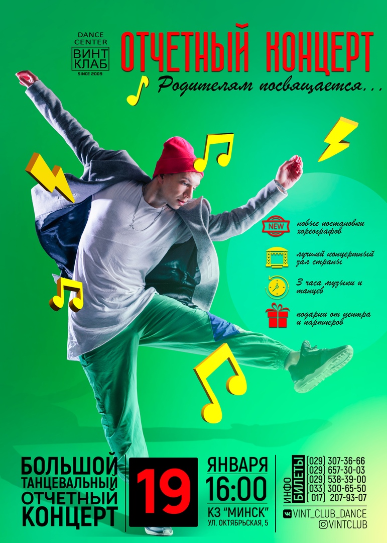Центр танца «ВИНТ-КЛАБ» с 2009 года ежегодно проводит большие концерты, которые превращаются в настоящий праздник для детей и их родителей, и всегда оставляют теплые воспоминания и яркие впечатления. За годы работы было организовано более 20 масштабных мероприятий и около 14000 юных танцоров приняли в них участие.