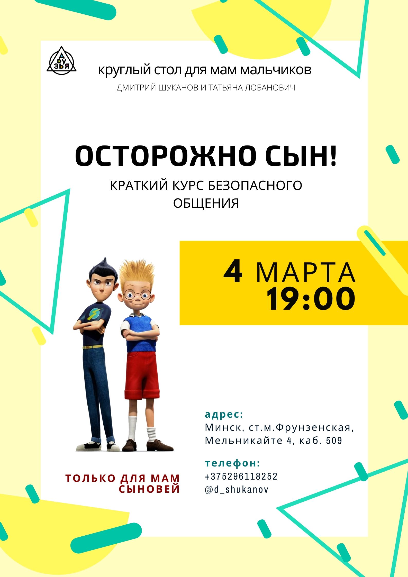 Встреча только для мам сыновей. Вместе с психологом, специалистом в сфере семейных отношений Татьяной Лобанович и экспертом в направлении развития мальчиков Дмитрием Шукановым участники рассмотрят сложные, противоречивые процессы в воспитании сына под мужским и женским углом восприятия. Это не просто встреча в формате лекции, где лекторы говорят, а вы слушаете. Разберут конкретные ситуаций из зала, а вы получите навыки и инструменты, которые помогут наладить отношения с сыном.