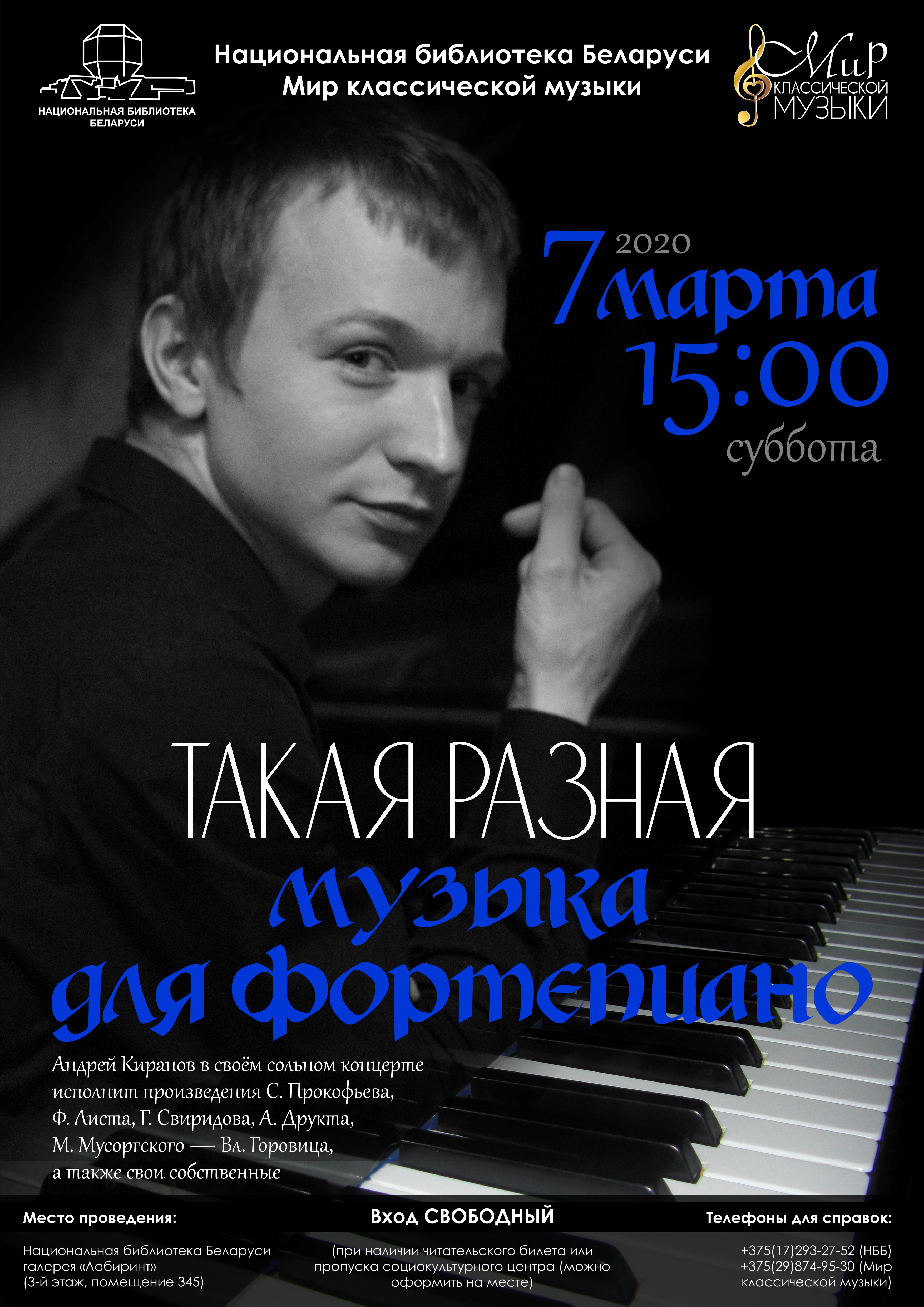 7 марта 2020 в галерее «Лабиринт» читатель Национальной библиотеки, пианист и композитор Андрей Киранов в своём сольном концерте исполнит произведения Ф. Листа, А. Друкта, С. Прокофьева, Г. Свиридова, М. Мусоргского — Вл. Горовица, а также свои собственные. О каждом исполняемом произведении Андрей Киранов расскажет краткую историю.