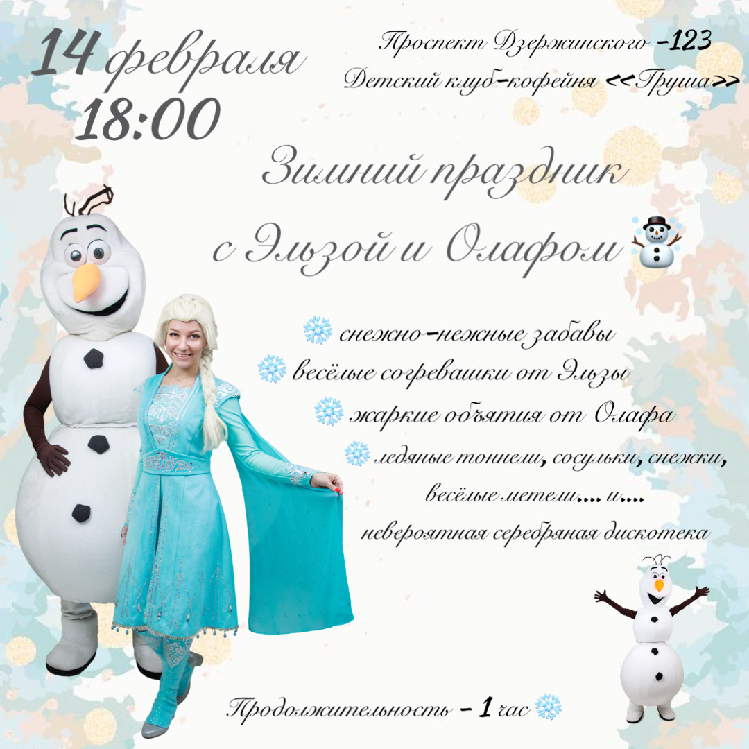 Студия детских праздников "Каравай" и Детский клуб - кафе "Груша" приглашают всех на зимний праздник с Эльзой и Олафом. Мультфильм «Холодное сердце» покорил сердца всех девчонок и мальчишек. Искренние улыбки и неверные эмоции от «жарких объятий» доставят массу радости родителям и ребятам. Это будет волшебный праздник наполненный увлекательными приключениями.