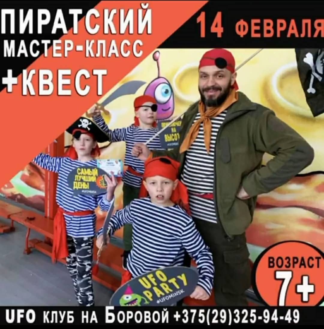 14 февраля в 12:00 пройдет мастер-класс "Благородные пираты" для мальчишек 7+. После мастерской ребят, уже вошедших в образ, ждёт КВЕСТ "Планета сокровищ". Ребята будут проходить испытания, добывать карту, собирать ключи на трассе верёвочного городка и смогут открыть сундук старого Джека.