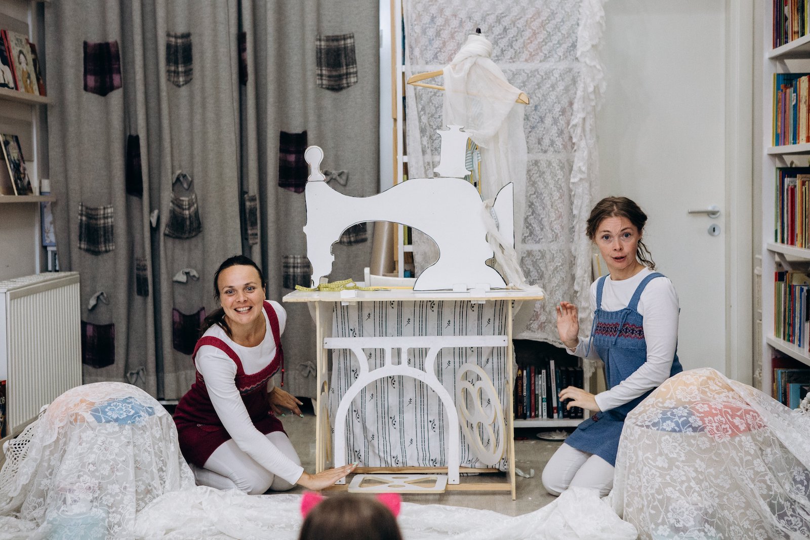 Что может получиться, если в мастерскую к маме заберутся две маленькие сестренки? Таинственная швейная машинка вдруг оживет и замашет крыльями, разгонится скоростным поездом и заскрипит старым патефоном. Мамины ткани превратятся в горы и реки, травы и цветы, маленькие катушки застучат словно барабанчики, сестрички, забравшиеся в мастерскую, играючи превращаются в взаправдашних медведя и тюленя, а ленты и клубки ниток... Но, не будем раскрывать секреты, ведь лучше увидеть все собственными глазами.