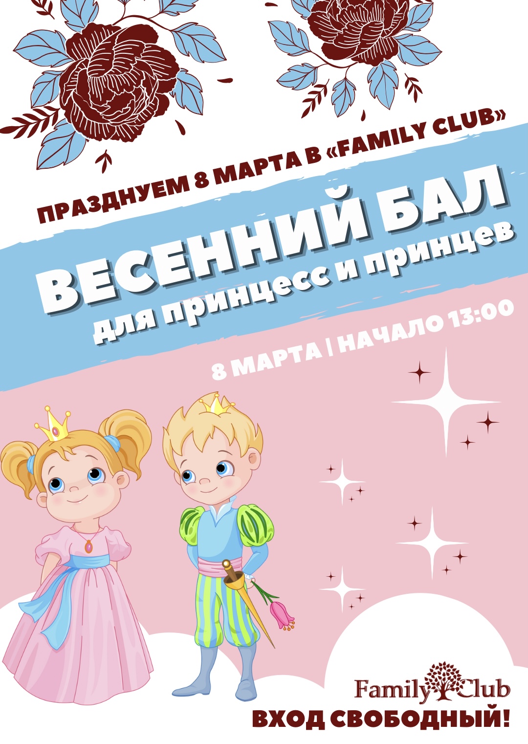 Кафе «Family club» приглашает всех девчонок и мальчишек на праздник весны - 8 марта. Весенний бал для принцесс и принцев. Вместе с героиней все гости праздника отправятся в путешествие по замкам самых популярных принцесс. Подводный замок Ариэль, башня Рапунцель, восточные танцы от Алладина и головоломки от Бэль и многое другое.