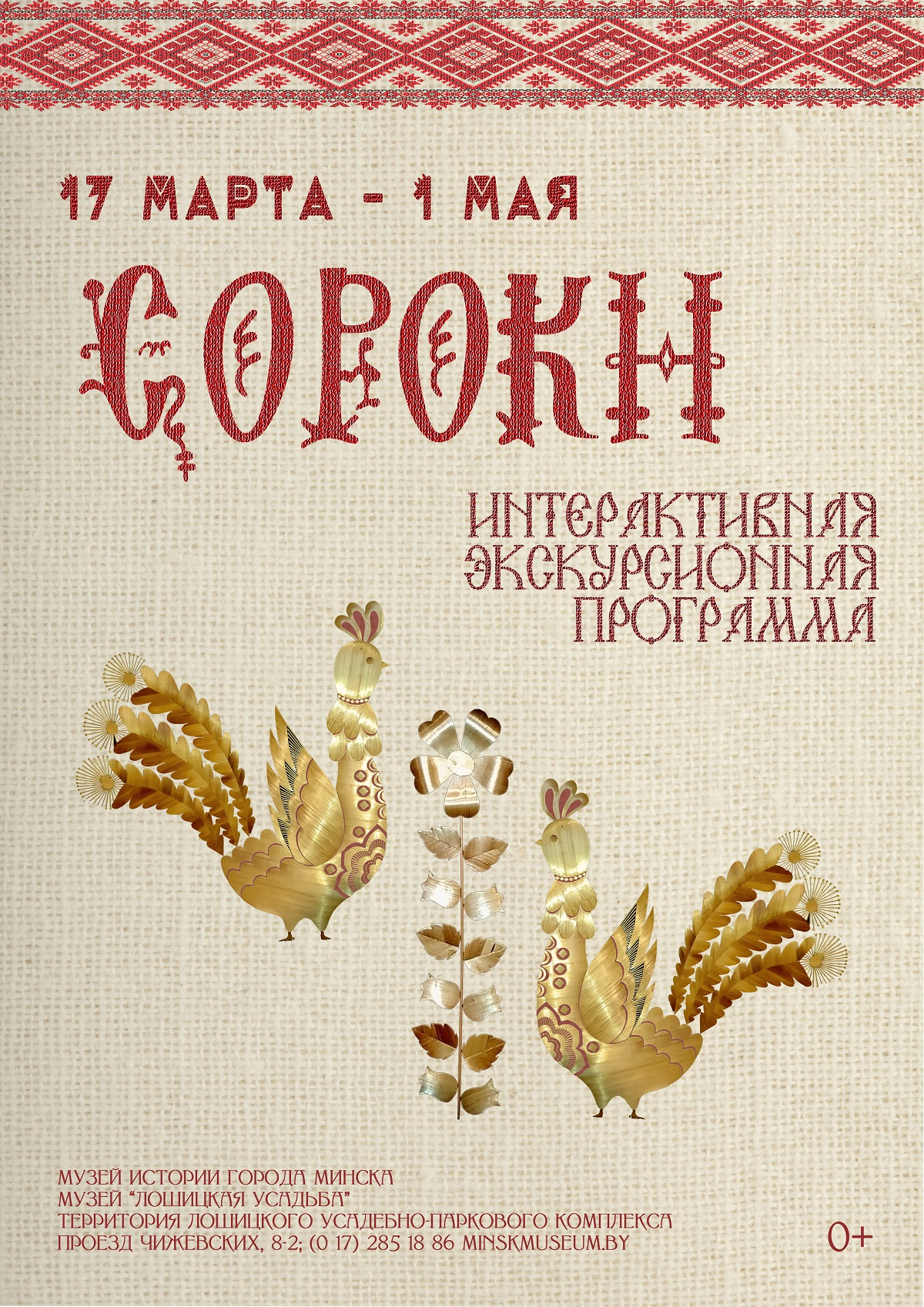 «Лошицкая усадьба» приглашает на интерактивную экскурсионную программу «Сороки» по выставке современного народного декоративно-прикладного искусства «Скарбонка памяці». Программа «Сороки» разработана на материалах белорусского народного календаря и посвящена встрече весны. Экскурсия проводится по предварительной записи.