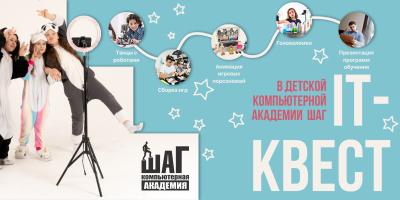 Вас и Ваших детей приглашают 27 марта в 10:30 на IT-квест в Детской Компьютерной Академии ШАГ. В программе для детей — квест по локациям с мастер-классами по нескольким направлениям. Начнут с разминки, танцы с роботами, соберут игру как пазл, создадут и оживят игровых персонажей И пройдут умопомрачительные головоломки.