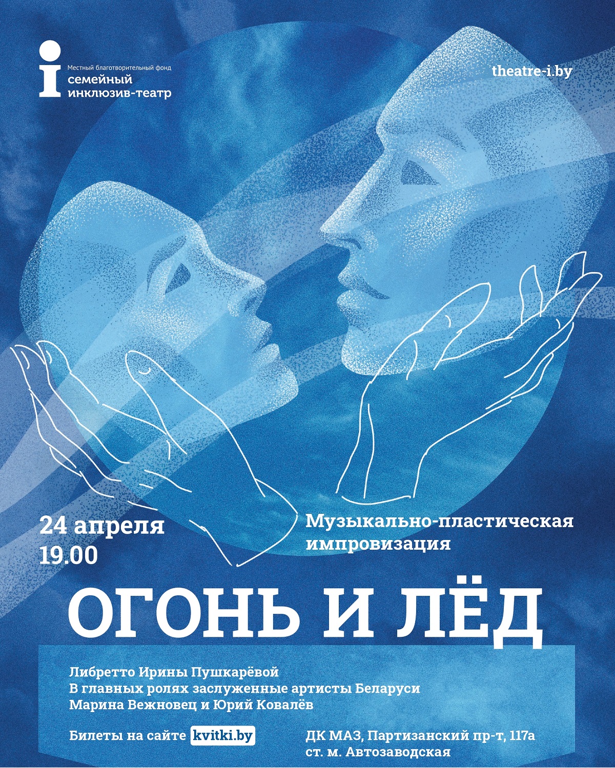 «Огонь и Лёд» – импровизационный пластический спектакль-притча о творческом начале человека, история поколений, сменяющих друг друга, и любви, освещающей все вокруг себя. В центре сюжета, придуманного руководителем театра Ириной Пушкаревой, – Мастер, который каждую работу делает похожей на свою Музу, но лучшая из всех – это их дети и ученики, которые потом сами становятся Мастерами.