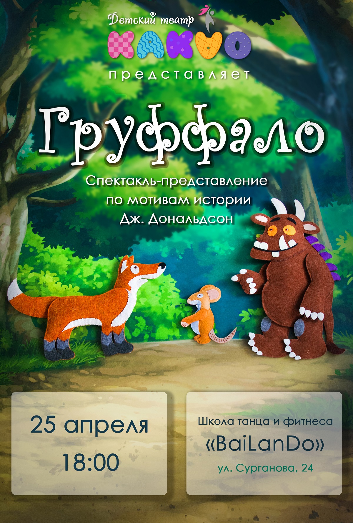 Детский театр «Какао» представляет интерактивный спектакль-представление по мотивам истории английской писательницы Джулии Дональдсон «Груффало». Ребят ждёт поучительная сказка о победе над своими страхами, смелости, сообразительности и находчивости!