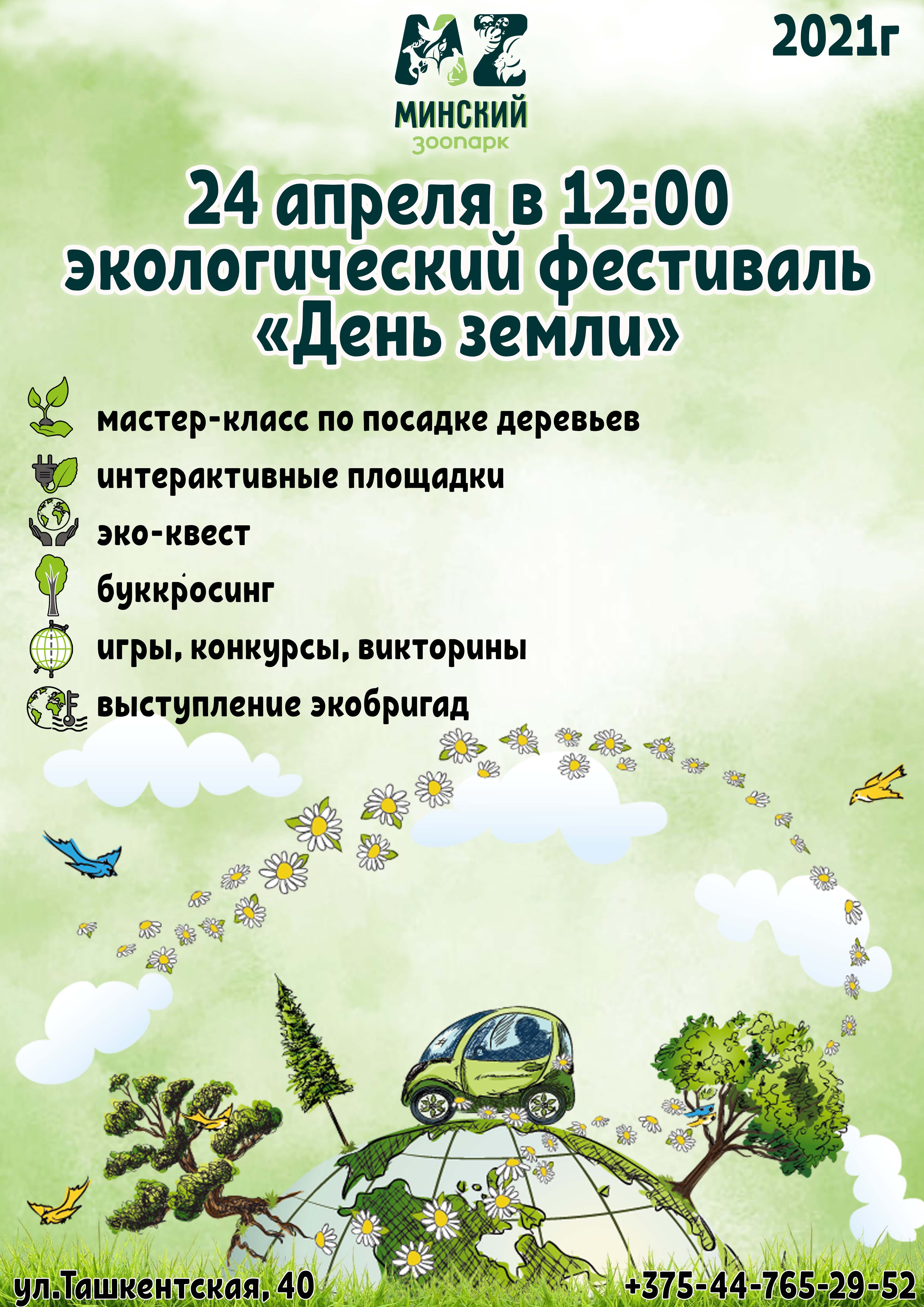 Минский зоопарк приглашает 24 апреля 2021 года на экологический фестиваль «День земли- 2021». Для гостей фестиваля пройдет мастер-класс по посадке деревьев, будут работать интерактивные площадки, экоквест и буккроссинг.
