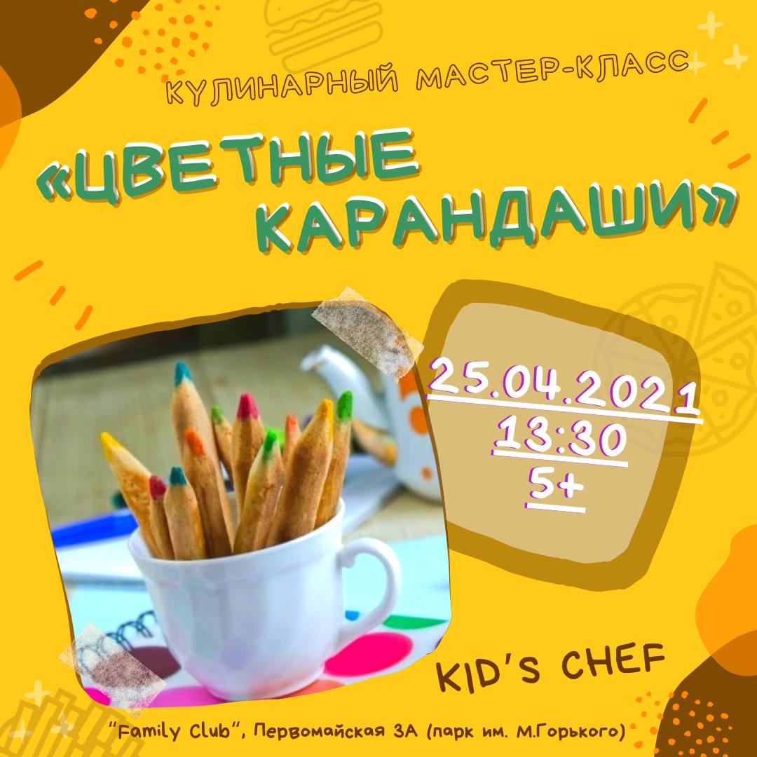 В это воскресенье приглашают ребят приготовить цветные карандаши, которые можно легко скушать. Приготовление блюда происходит с 0 до готового варианта. Каждый участник мастер-класса сделает полноценный набор из ярких карандашей, которые заберёт с собой.