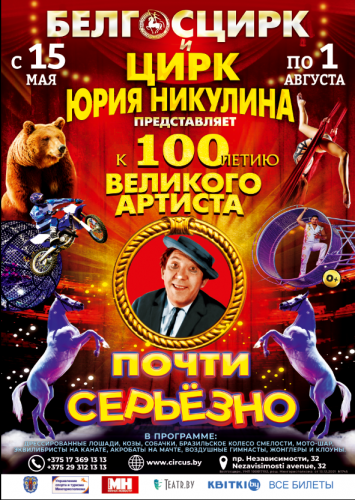 В программе: дрессированные лошади, медведи, козы, бразильское колесо смелости,мото-шар, эквилибристы на канате, акробаты на мачте, воздушные гимнасты, жонглеры и клоуны! Спешите!