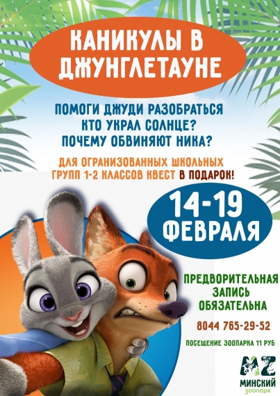 С 14 февраля по 19 февраля в Минском зоопарке при покупке входных билетов для организованных школьных групп квест: Каникулы в ДжунглеТауне БЕСПЛАТНО.