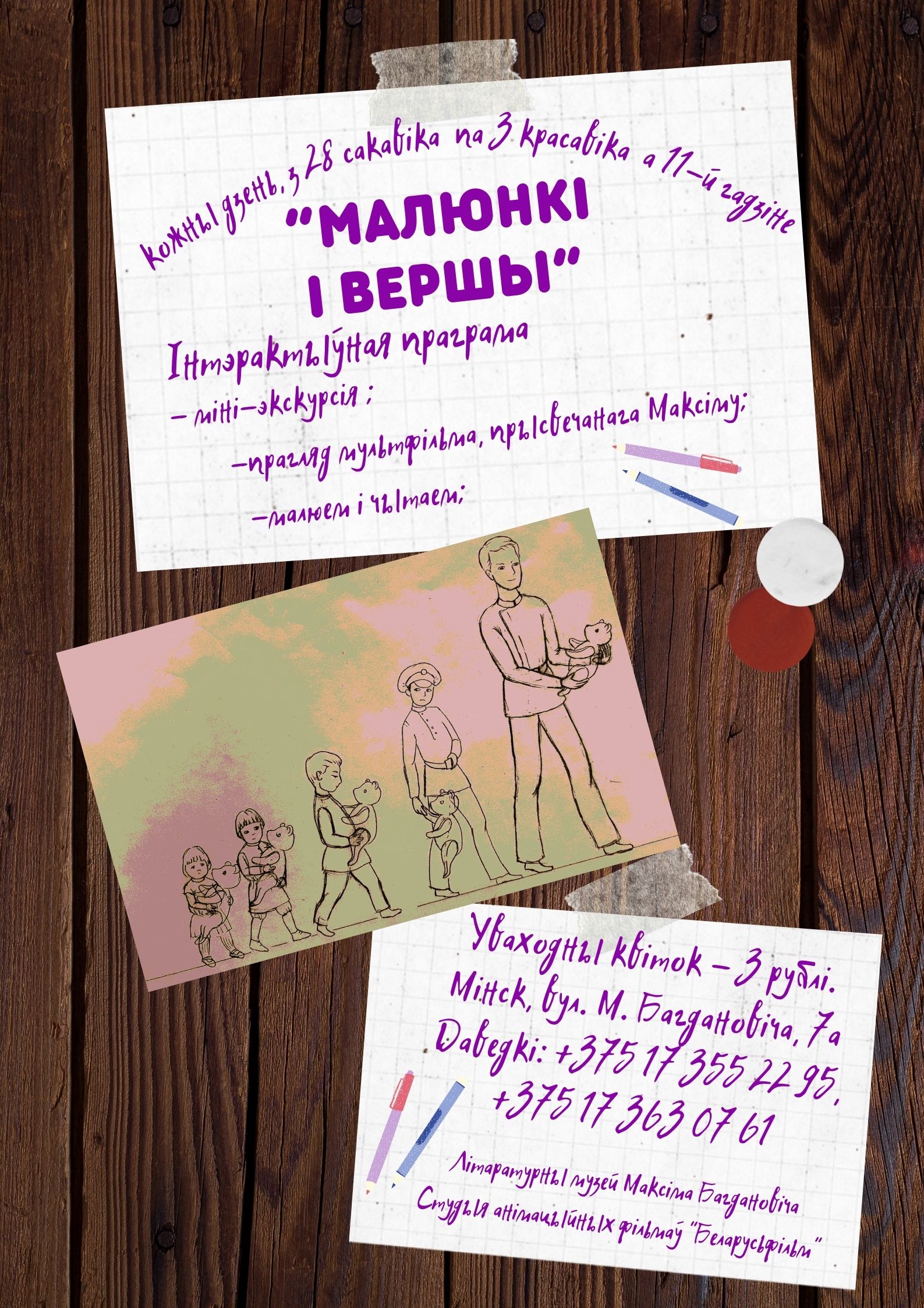 Кожны дзень цягам вясновых канікул! З 28 сакавіка па 3 красавіка а 11-й гадзіне Літаратурны музей Максіма Багдановіча сумесна са Студыяй анімацыйных фільмаў «Беларусьфільм» запрашае дзетак 6+ наведаць інтэрактыўную праграму «Малюнкi iвершы».