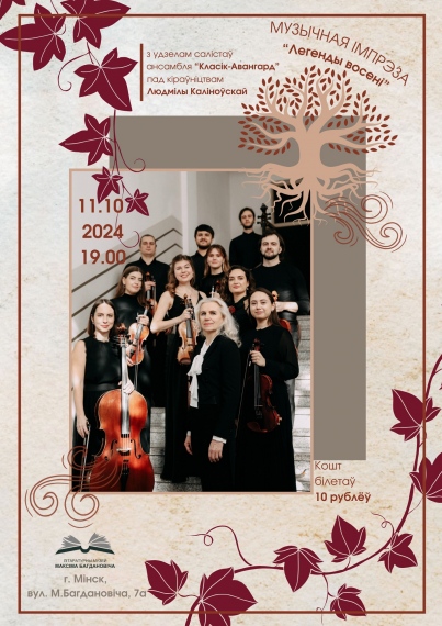 У Беларусь завітала сапраўдная восень, а ў Літаратурным музеі Максіма Багдановіча працягваюцца музычныя вечары. Гэтым разам 11 кастрычніка а 19-й гадзіне адбудзецца імпрэза «Легенды восені» з удзелам ансамбля салістаў «Класік-Авангард» пад кіраўніцтвам Людмілы Каліноўскай.