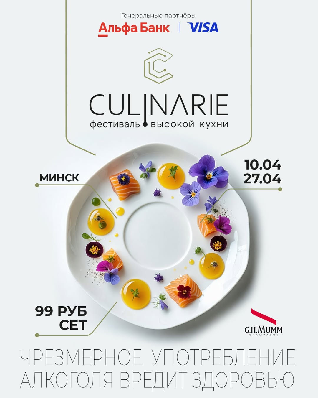 С 2 по 19 октября столичные рестораны предложат посетителям специальный сет из блюд высокой кухни. Эффектная подача, нетривиальные сочетания, потрясающие ароматы и заботливое обслуживание — все это воплощает в себе фестиваль Culinarie. Стоимость сета - 99 BYN.