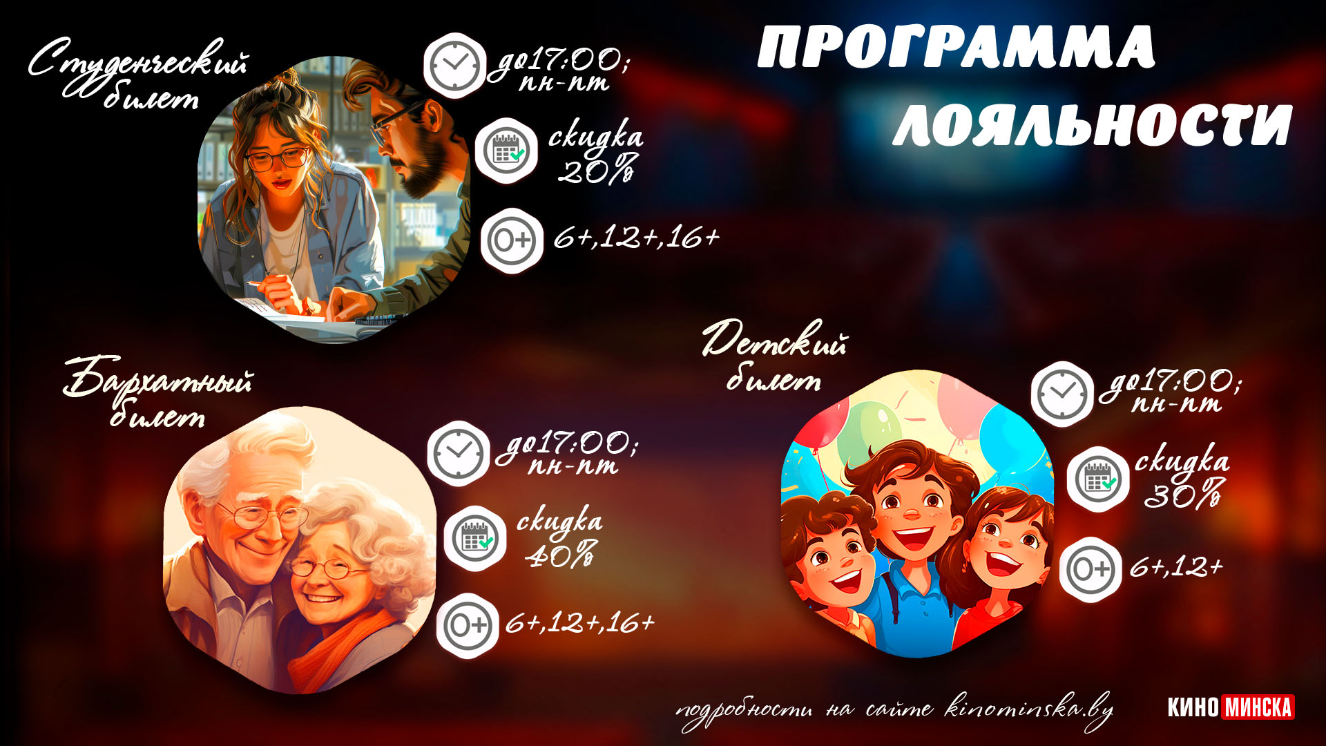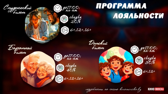 С 6 февраля сеть кинотеатров «КиноМинска» запускает три уникальных предложения, которые понравятся студентам, детям и пенсионерам. Напомним, в сеть входят 13 кинотеатров: «Аврора», «Беларусь», «Берестье», «Дом кино», «Киев», «Комсомолец», «Мир», «Москва», «Октябрь», «Пионер», «Победа», «Ракета», «Салют» и «Центральный».