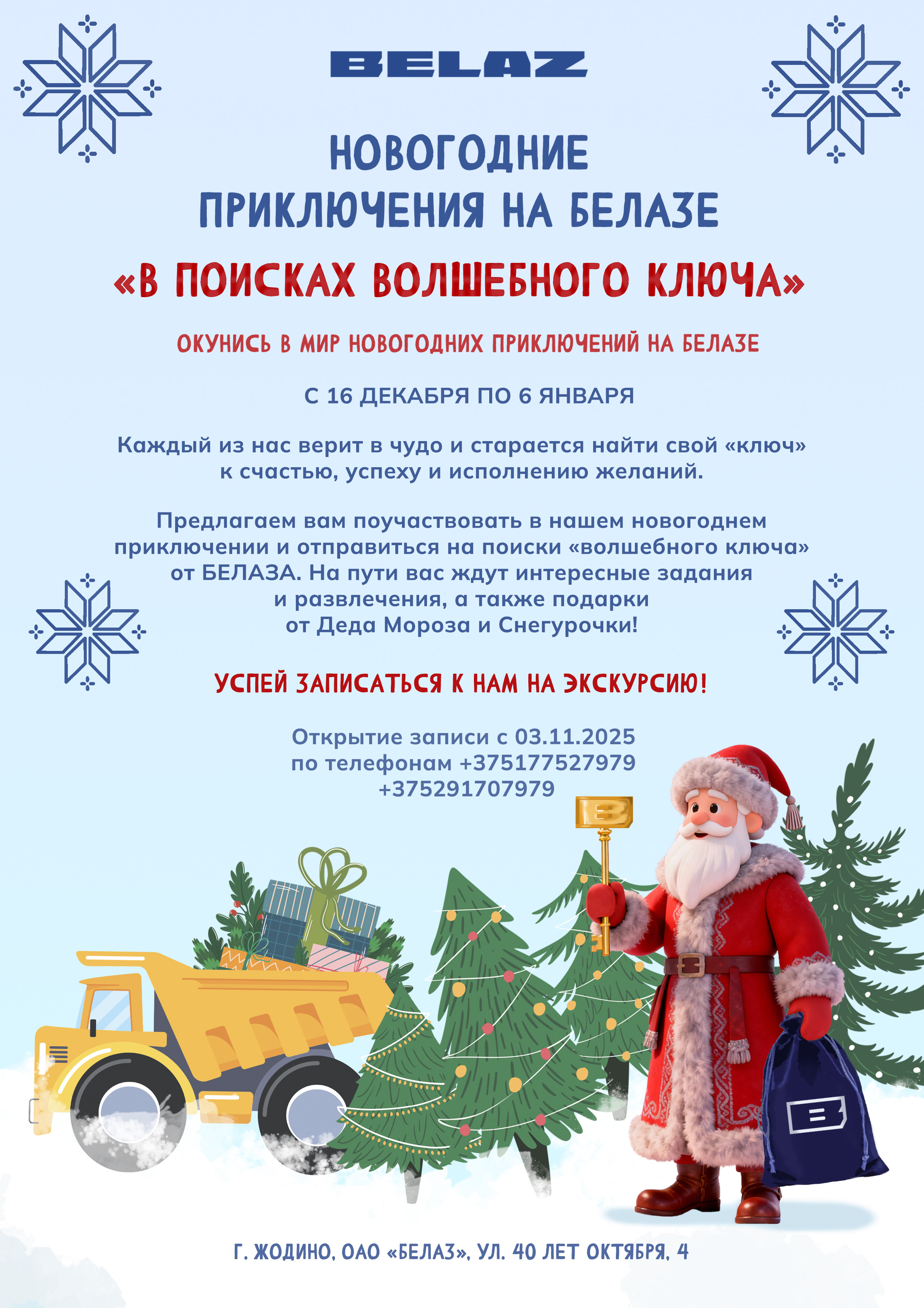 В дни новогодних и рождественских каникул БЕЛАЗ приглашает детей и взрослых отправиться в удивительное путешествие по территории индустриального гиганта. Вас будут сопровождать необычные экскурсоводы — главные зимние волшебники: Дед Мороз, Снегурочка и их сказочные спутники. Интерактивная программа «В поисках волшебного ключа» доступна с 16 декабря по 6 января.